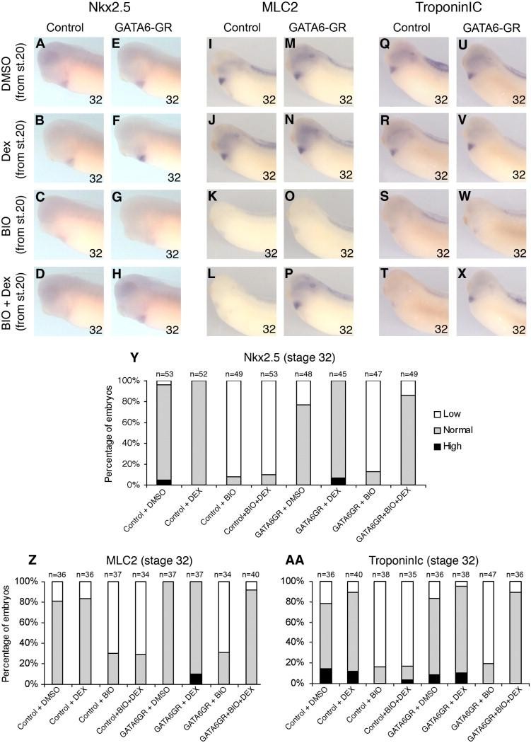 Fig. 7. Stage-specific activation of GATA6 during organogenesis stages rescues reduction of cardiomyogenic genes caused by activation of Wnt/β-catenin signaling. (AâX) Analysis of Nkx2.5 (AâH), MLC2 (IâP) and TroponinIc (QâX) expression with whole-mount RNA in situ hybridization at stage 32 in uninjected (AâD, IâL, QâT) and GATA6GR-injected (EâH, MâP, UâX) embryos treated from stage 20 with DMSO (A, E, I, M, Q, U); Dexamethasone alone (B, F, J, N, R, V); BIO alone (C, G, K, O, S, W); and BIO and Dexamethasone together (D, H, L, P, T, X). Note in embryos with activated GATA6GR only slightly increased Nkx2.5 (F), MLC2 (N) and TroponinIc expression (V); in embryos with BIO-mediated activated Wnt/β-catenin signaling clearly reduced Nkx2.5 (C, D, G), MLC2 (K, L, O) and TroponinIc expression (S, T, W); but note restored Nkx2.5 (H) MLC2 (P) and TroponinIc (X) expression in embryos where BIO-mediated activated Wnt/β-catenin signaling is combined with activated GATA6GR. (Y-AA) Bar charts showing the percentage of embryos with high, normal, or low Nkx2.5 (Y), MLC2 (Z) and TroponinIc (AA) expression in the experiments illustrated in panels AâX (n = number of embryos assayed for each treatment). |