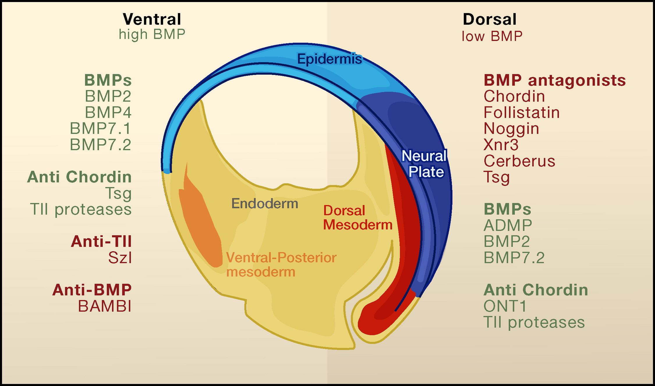 Bone morphogenetic proteins (BMPs) are essential regulators of vertebrate development. Chordin, Follistatin, Noggin, Xnr3, and Cerberus are BMP antagonists that are important for tuning BMP signaling and are expressed in the organizer on the dorsal side of the embryo. Chordin is itself regulated through degradation by the Tolloid proteases that are brought into its proximity by the scaffold protein ONT1 (Inomata et al., 2008). The BMP antagonist twisted gastrulation (Tsg in Xenopus and Drosophila and twsg1 in mice) cooperates with Chordin to block BMP activity and is ubiquitously expressed. Among the BMPs, antidorsalizing morphogenetic protein (ADMP) is specific to the dorsal side of the embryo and is induced by low BMP concentrations, whereas the other BMPs are still present in the organizer but are more generally expressed. ONT1 is expressed ubiquitously at first but becomes progressively localized to the organizer region; Tolloid-related genes (Tll) are ubiquitously expressed. BMP4 is localized specifically to the ventral side at the mid-gastrula stage. Tsg also interacts with Chordin and BMP complexes to promote Chordin degradation and to liberate BMP, although in Xenopus the BMP antagonist role illustrated for the dorsal side predominates. The negative feedback components of BMP signaling include Sizzled, which binds to Xolloid-related proteases and prevents Chordin degradation. BAMBI is a decoy BMP receptor expressed in response to BMPs.