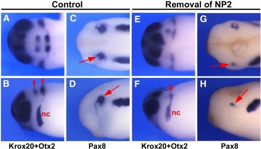 Fig. 4. Ablation of the NP2 domain reduces the otic expression of Pax8 in stage 23/24 embryos. Otx2 (forebrain and eyes) and Krox20 (rhombomeres 3 and 5, arrowheads) (A, B) and Pax8 (C, D) otic expression (arrows) in control embryos at stage 23/24. (EâH) Unilateral ablation of NP2 domain results in reduced Pax8 expression on the manipulated side (GâH; arrows). Sibling embryos after NP2 domain removal (E, F) show reduced Krox20 expression in the hindbrain (residual rhombomere 5 expression can be detected in these embryos; arrowhead) without affecting Krox20 expression domain in the neural crest (nc). Dorsal (A, C, E, G) and lateral (B, D, F, H) views, anterior to left.
