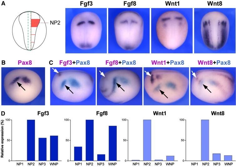 Fig. 7. Developmental expression of putative hindbrain-derived otic-inducing factors. (A) Fgf3, Fgf8, Wnt1 and Wnt8 are expressed in a region of NP corresponding to NP2 domain at the early neurula stage; dorsal views, anterior to top. (B) Pax8 otic expression at stage 15 (black arrow). (C) Double in situ hybridization showing the relationship of expression of Pax8 (black arrows; green staining) and Fgf3, Fgf8, Wnt1 and Wnt8 (white arrows; purple staining) at the neurula stage. Lateral views, anterior to the left. At this stage Wnt8 is also expressed outside of the hindbrain in a region of the ectoderm presumably corresponding to the neural crest. (D) Real-Time RT-PCR analysis of Fgf3, Fgf8, Wnt1 and Wnt8 expression in various segments of NP (NP1, NP2 and NP3) shortly after dissection. All four ligands are enriched in NP2 domain. WNP; whole NP.