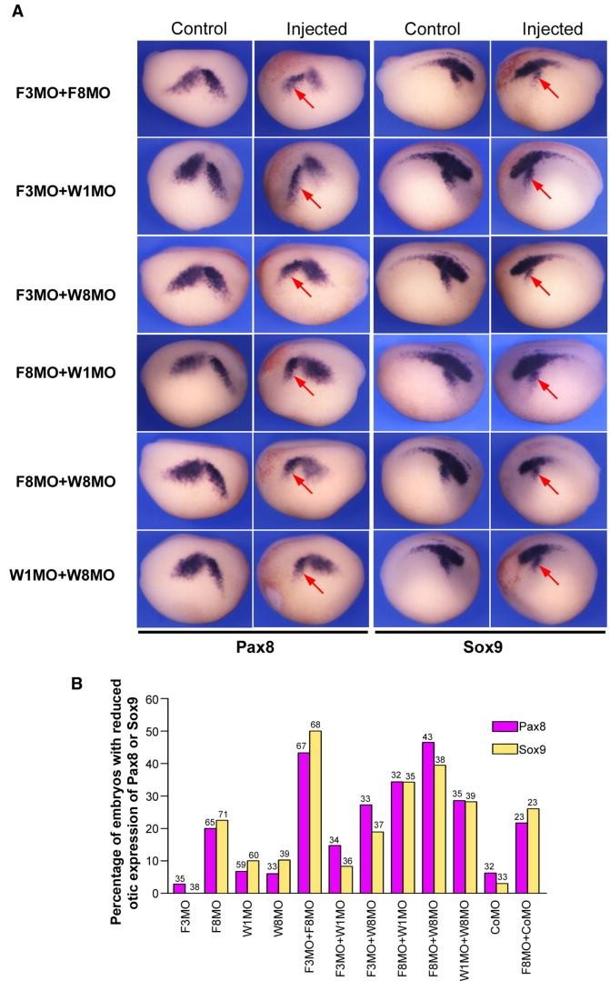 Fig. 8. Wnt and Fgf signaling are required for otic placode specification. (A) Embryos injected with different combinations of Fgf3 (F3MO), Fgf8 (F8MO), Wnt1 (W1MO) and Wnt8 (W8MO), morpholino antisense oligonucleotides show reduction of Pax8 and Sox9 otic expression at the neurula stage (stage 15). The affected otic domain is indicated by an arrow on the injected side. In these embryos two morpholinos were co-injected at the 4-cell stage to target the NP. For the same embryos the control and injected sides are shown for comparison. Lateral views. For the control panels anterior to right. For the injected panels anterior to left. (B) Quantification of the in situ hybridization results. The number on the top of each bar indicates the number of embryo analyzed.