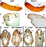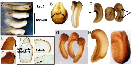 Figure 3. Phenotypes resulting from overexpression of ashwin. AâC: Embryos were injected in the animal pole with 0.2 ng of mRNA encoding ashwin. A: At stage (st.) 37, a set of three headless embryos at the bottom; the top embryo is a sibling control embryo injected with 0.2 ng of β-galactosidase mRNA (LacZ). B: Representative embryos displaying ashwin-induced split axes at st. 20 and st. 26. The embryo on the left also has open neural folds. C: Stage 22, dorsal view; these embryos display defects in neural tube closure (arrow) and epidermal integrity (arrowhead). In one embryo, the neural folds have not formed and the primary axis is split (asterisk). D,E: Embryos injected in the animal pole with 0.2 ng of myc-ashwin. Distribution of myc-ashwin was visualized using immunohistochemistry, and embryos were cleared in benzyl benzoate: benzyl alcohol (BB:BA) to reveal interior structures. Arrows indicate cement glands. The embryo with little myc-ashwin in the anterior region has a relatively normal head (D), whereas the embryo in E has anterior defects and stronger anterior myc-ashwin expression. F: Stage 22; cross-sections showing thickening of abnormal epithelium; a section of a control embryo (LacZ) is included for comparison. G,H: Embryos injected equatorially in two dorsal blastomeres at the four-cell stage with 0.2 ng of myc-ashwin and stained to reveal myc-ashwin distribution. G: Strong expression of myc-ashwin in neural ectoderm leads to distended heads and defects in neural tube closure. H: Strong expression of myc-ashwin in dorsal mesoderm leads to anterior truncations. I: Embryo injected with 0.2 ng of ashwin mRNA in two ventral blastomeres at the four-cell stage; this embryo shows the maximal extent of abnormalities obtained with ventral injections. |