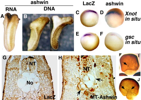 Figure 6. Secondary axis formation in embryos overexpressing ashwin. A,B: Two-cell stage embryos were microinjected in the animal pole with either 0.25 ng of ashwin mRNA (A) or 1 ng of ashwin DNA (B). The split axis phenotype is generated at a similar frequency by either RNA or DNA injections. CâF: Embryos were injected as described with 0.25 ng of ashwin RNA. C,D: Expression of Xnot1 in control early gastrulae (LacZ; C) and gastrulae injected with 0.25 ng ashwin mRNA (D). There is no difference in Xnot1 expression between ashwin- and control-injected embryos. E,F: Expression of gsc in control early gastrulae (E) and gastrulae after injection of 0.25 ng of ashwin mRNA (F). Expression of gsc is reduced in embryos overexpressing ashwin. G,H: Sections through the trunk of stage 20 embryos expressing either LacZ (G) or MT-Ashwin (H). MT-ashwin was injected at a concentration of 0.2 ng into two blastomeres at the two-cell stage. Ectopic MT-ashwin is detected with anti-myc antibody (redâorange staining). The notochord (No) is split into two in the Ashwin embryo (arrows). No, notochord; NT, neural tube. I,J: Embryos injected with 0.2 ng of mRNA encoding myc-ashwin, stained to visualize myc-ashwin, and cleared to reveal interior structures. I: Dorsal view revealing outline of archenteron in early midgastrula embryo; archenteron shape is characteristic of over 75% of injected embryos. J: Dorsal view of midgastrula embryo shows bifurcation at leading edge of archenteron. Arrows indicate tips of archenteron. |