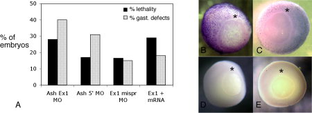 Figure 8. Disruption of ashwin expression by means of morpholino oligonucleotide (MO) -mediated knockdown leads to lethality, gastrulation defects, and apoptosis. A: Frequencies of lethality at gastrulation and gastrulation defects in embryos injected with MO directed against ashwin. Embryos were injected with 10 ng of MOs against the ashwin exon I splice junction (Ash Ex1 MO), the ashwin translation start site (Ash 5â² MO), or the five-base mispair of the exon I MO (Ex 1 mispr MO). Additional embryos were injected with 10 ng of Ash Ex1 MO and 0.1 ng of Ashwin mRNA, to determine whether ashwin mRNA could rescue the effects of the Ex1 MO. Typical gastrulation defect elicited by Ash Ex1 MO is shown in B. BâE: Terminal uridine nucleotide end labeling (TUNEL) assays of gastrula embryos injected with either 10 ng of Ash Ex1 MO (B), 200 pg of ashwin mRNA (C), 10 ng of control MO (D), or 200 pg of β-galactosidase mRNA (E). Asterisks indicate the position of the dorsal blastopore lip. |