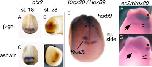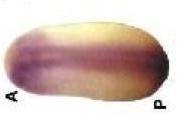 Figure 2. Spatial and temporal analysis of ashwin expression. Dorsal is toward the top, unless otherwise indicated. A: Stage (st.) 10; ashwin is expressed throughout the dorsal circumblastoporal zone. An arrow indicates the dorsal lip. B: A st. 12, dorsal view; expression is detected throughout the dorsal ectoderm and marginal zone. C: St. 12, ventral view; expression is excluded from the ventral hemisphere except for the circumblastoporal ring. D: Embryo hybridized with a sense probe. E: A st. 18, dorsal view; expression is visible in the neural ectoderm. F: A st. 18, frontal view reveals expression in anterior neural folds. G: A st. 18, midline sagittal dissection; expression is strongest in anterior and posterior neural domains but also is detected in the notochord and prechordal plate. H-K: At st. 22. H: Expression is detected throughout the developing nervous system and optic vesicles. I: Sense probe hybridization. J: Frontal view. K: Forebrain dissection; expression is detected in the ventral aspect of the brain and throughout the eye anlagen. L: At st. 26; ashwin is expressed throughout the central nervous system and in the tail bud. M: At st. 36; ashwin is expressed strongly in the brain and moderately in the posterior axial region. D, dorsal; V, ventral; A, anterior; P, posterior. N: Northern analysis of ashwin expression in Xenopus embryos at various embryonic stages. Each lane shows RNA isolated from two embryos at each of the stages indicated. The ashwin transcripts were visualized using a radiolabeled PCR probe. Two transcripts at 1.5 and 2.1 kb are expressed both maternally and zygotically. Levels of 18S and 28S rRNA are included to indicate the total amount of RNA loaded in each lane. |