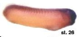 c2orf49 (chromosome 2 open reading frame 49) gene expression in Xenopus laevis embryo, assayed via in situ hybridization, NF stage 26, , lateral view, dorsal up, anterior right. |
