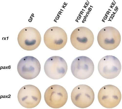 Genes referenced: dvl1 dvl2 efnb1 ephb1 fgf2 fgfr1 myc pax2 pax6 rax rhoa