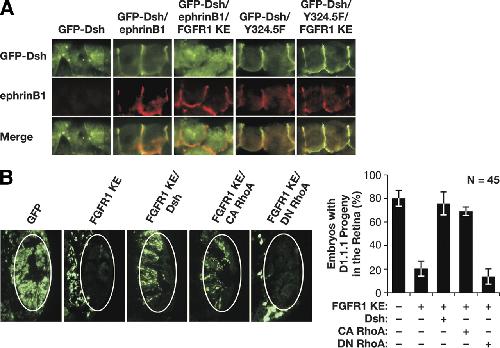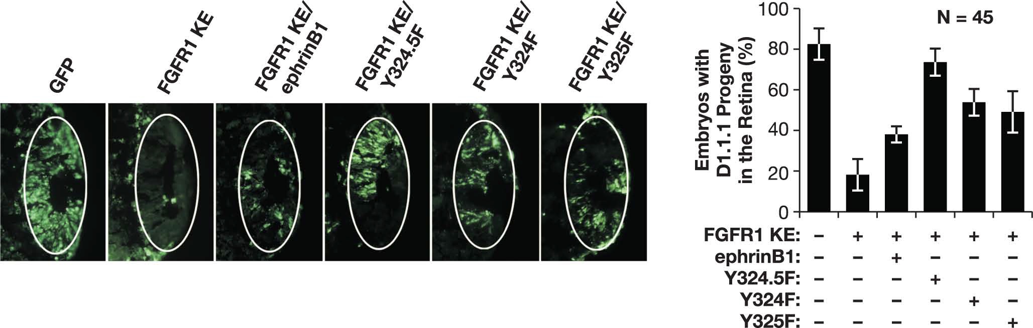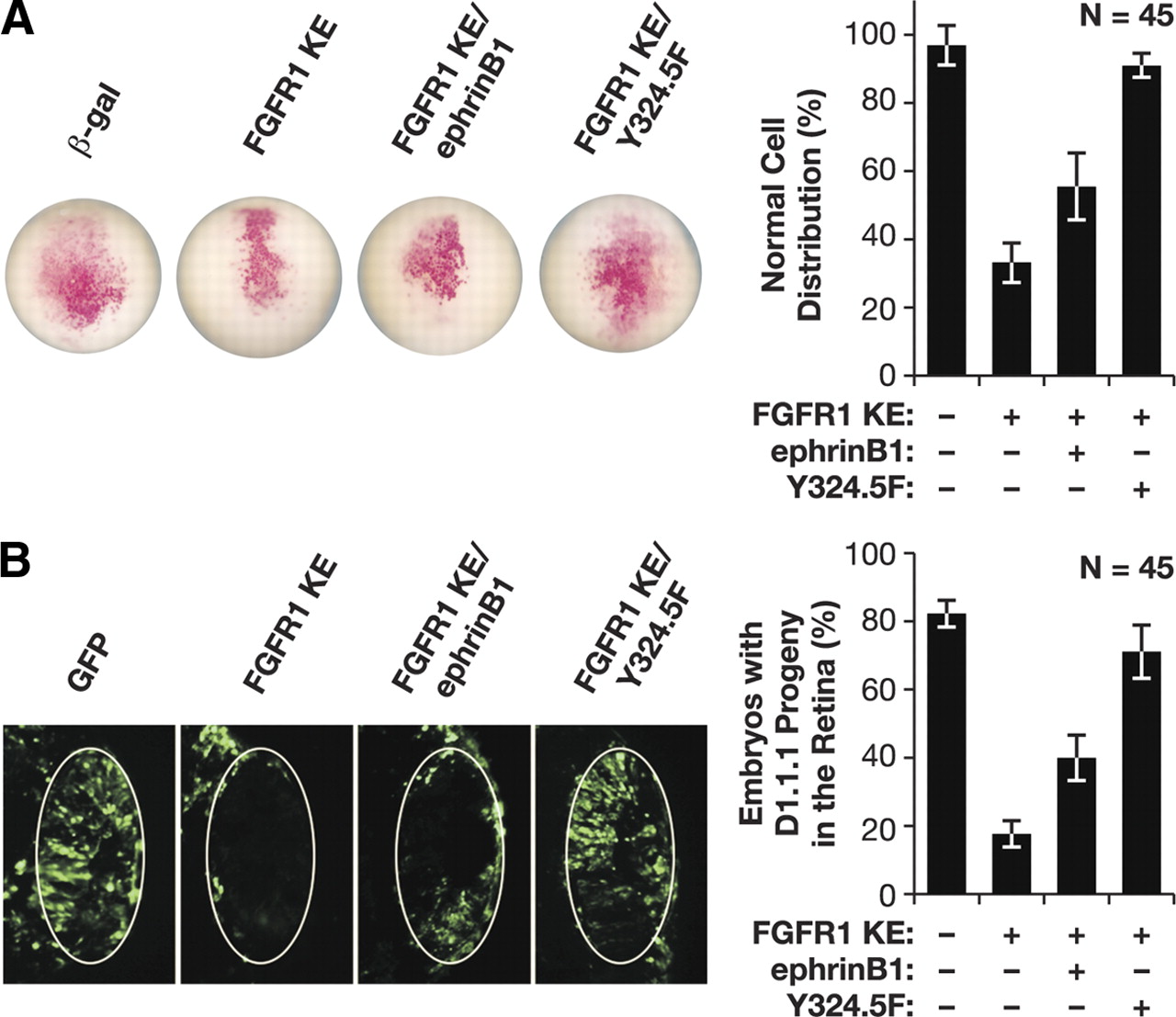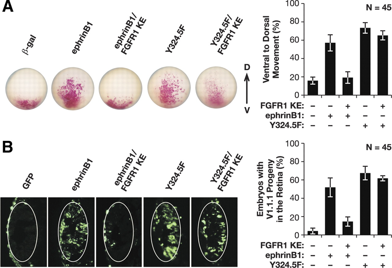 The Eph family of receptor tyrosine kinases and their membrane-bound ligands, the ephrins, have been implicated in regulating cell adhesion and migration during development by mediating cell-to-cell signaling events. The transmembrane ephrinB1 protein is a bidirectional signaling molecule that signals through its cytoplasmic domain to promote cellular movements into the eye field, whereas activation of the fibroblast growth factor receptor (FGFR) represses these movements and retinal fate. In Xenopus embryos, ephrinB1 plays a role in retinal progenitor cell movement into the eye field through an interaction with the scaffold protein Dishevelled (Dsh). However, the mechanism by which the FGFR may regulate this cell movement is unknown. Here, we present evidence that FGFR-induced repression of retinal fate is dependent upon phosphorylation within the intracellular domain of ephrinB1. We demonstrate that phosphorylation of tyrosines 324 and 325 disrupts the ephrinB1/Dsh interaction, thus modulating retinal progenitor movement that is dependent on the planar cell polarity pathway. These results provide mechanistic insight into how fibroblast growth factor signaling modulates ephrinB1 control of retinal progenitor movement within the eye field.