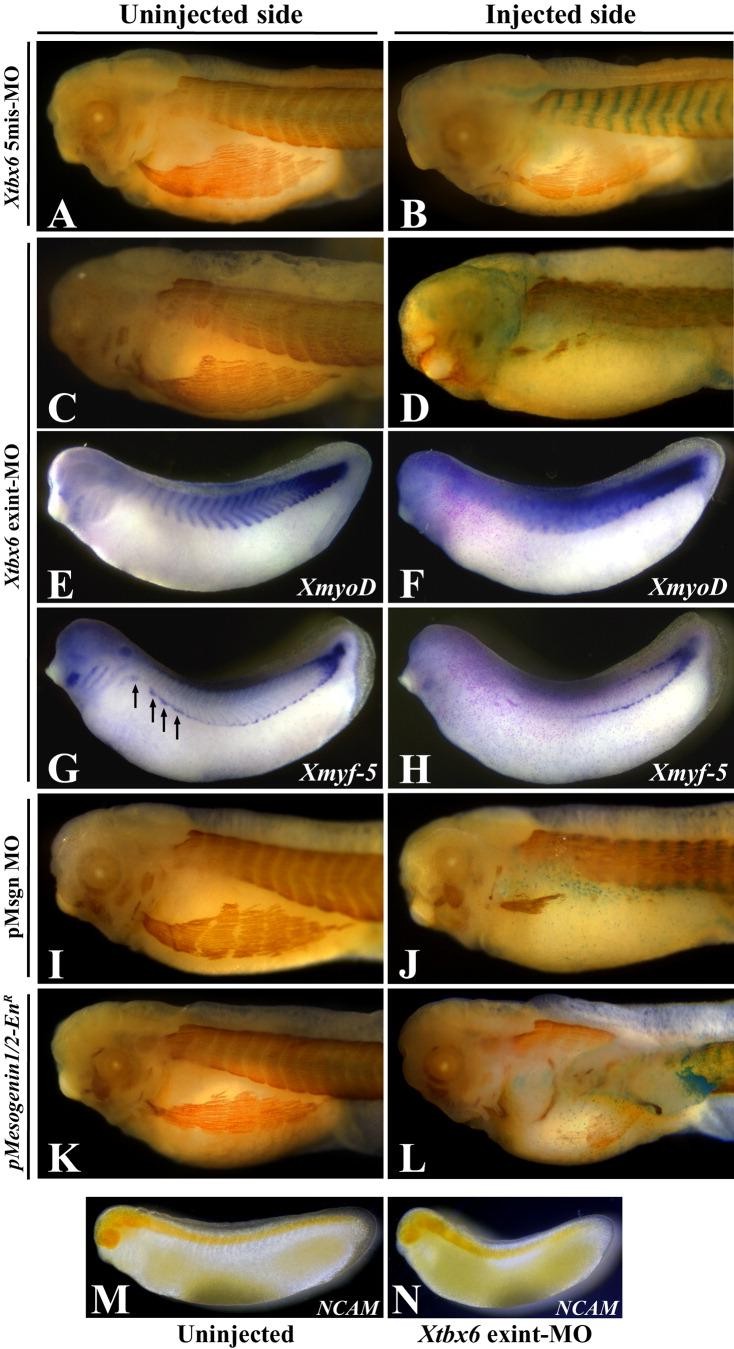 Figure 6. Knockdowns of Xtbx6 or pMesogenin1 and 2 cause somite malformation and ventral body wall muscle hypoplasia. Representative embryos injected with Xtbx6 5mis-MO (25 ng) (A, B), Xtbx6 exint-MO (25 ng) (C-H), pMsgn MO (50 ng) (I, J), or pMesogenin1-EnR and pMesogenin2-EnR (100 pg each) (K, L). In A-L, the uninjected sides are on the left (A, C, E, G, I, K) and injected sides on the right (B, D, F, H, J, L). In some cases, images are flipped horizontally to facilitate comparison. A-D, I-L: Immunohistochemistry with the 12/101 antibody at stage 41. E-H: Analysis of expression patterns of XmyoD (E, F) and Xmyf-5 (G, H) at stage 32 by whole-mount in situ hybridization. Arrows indicate the expression of Xmyf-5 in hypaxial muscle cells. M, N: The expression of NCAM was not detectably changed in Xtbx6 exint-MO (50 ng)-injected embryos at stage 30, revealed by 4d antibody staining.