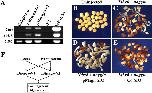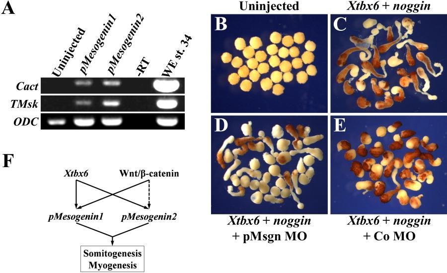 Figure 7. pMesogenin1 and 2 is involved in myogenesis initiated by Xtbx6. A: RT-PCR analysis of muscle marker gene expressions in the animal cap explants injected with pMesogenin1 (200 pg) or pMesogenin2 (200 pg) mRNA. B-E: Animal cap explants were immunostained with the 12/101 antibody at stage 24. B: Uninjected explants. C-E: Doses of injected mRNAs or MOs were Xtbx6 mRNA (50 pg), noggin mRNA (100 pg), pMsgn MO (100 ng), and Co MO (100 ng). Note that muscle differentiation was inhibited by pMsgn MO. F: Regulatory hierarchy in somitogenesis and myogenesis involving Xtbx6, Wnt/ beta -catenin signaling, pMesogenin1 and 2. Solid arrows indicate known controls and the dashed arrow, the deduced control; for details see Discussion section.