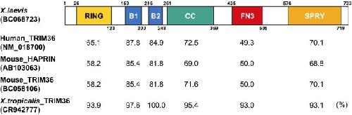 Fig. 1. Comparison of the TRIM36/HAPRIN amino acid sequence among species. Predicted TRIM36/HAPRIN amino acid sequences of X. laevis (GenBank Accession No.