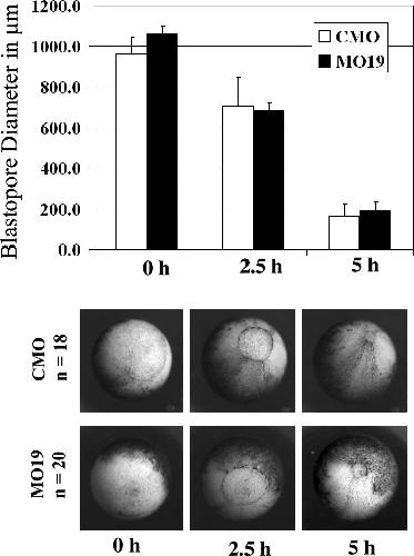 Fig. 4. ADAM19 is not required for blastopore closure. Time-lapse imaging of gastrula stage embryos injected with either a control MO (CMO) or the MO19. Embryos were microinjected with 10 ng of MO at the one-cell stage and allowed to develop through the end of gastrulation. The blastopore size in micrometers was measured using the OpenLab software at three different time points during gastrulation. The values represent the average of three different experiments using 8 embryos each for the control and the experimental. Error bars correspond to standard deviation from the mean. Representative images are shown below the histogram.