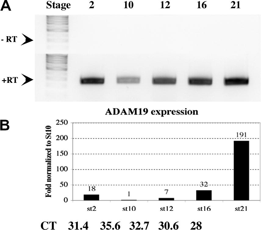 Fig. 1. ADAM19 expression. Quantitative real-time PCR expression of ADAM19 during early Xenopus development. Polyadenylated RNA from 2.5 embryos was used to make cDNA. PCR amplification was performed on a light cycler for 40 cycles. (A) The amplification product from both the control (âRT) and the experimental (+RT) were separated on a 2% agarose gel. (B) The relative abundance of the ADAM19 mRNA was measured by the 2(-δCT) method using stage 10 as a value of 1. Values are not adjusted to a control gene but to identical number of embryos. The CT values for each reaction are given below the graph. No CT values were obtained for the âRT control of each stage. ADAM19 mRNA is present as a maternal transcript at stage 2. Zygotic transcription starts during gastrulation and increases during neurulation (stage 16) continuing into early tailbud stage (stage 21).