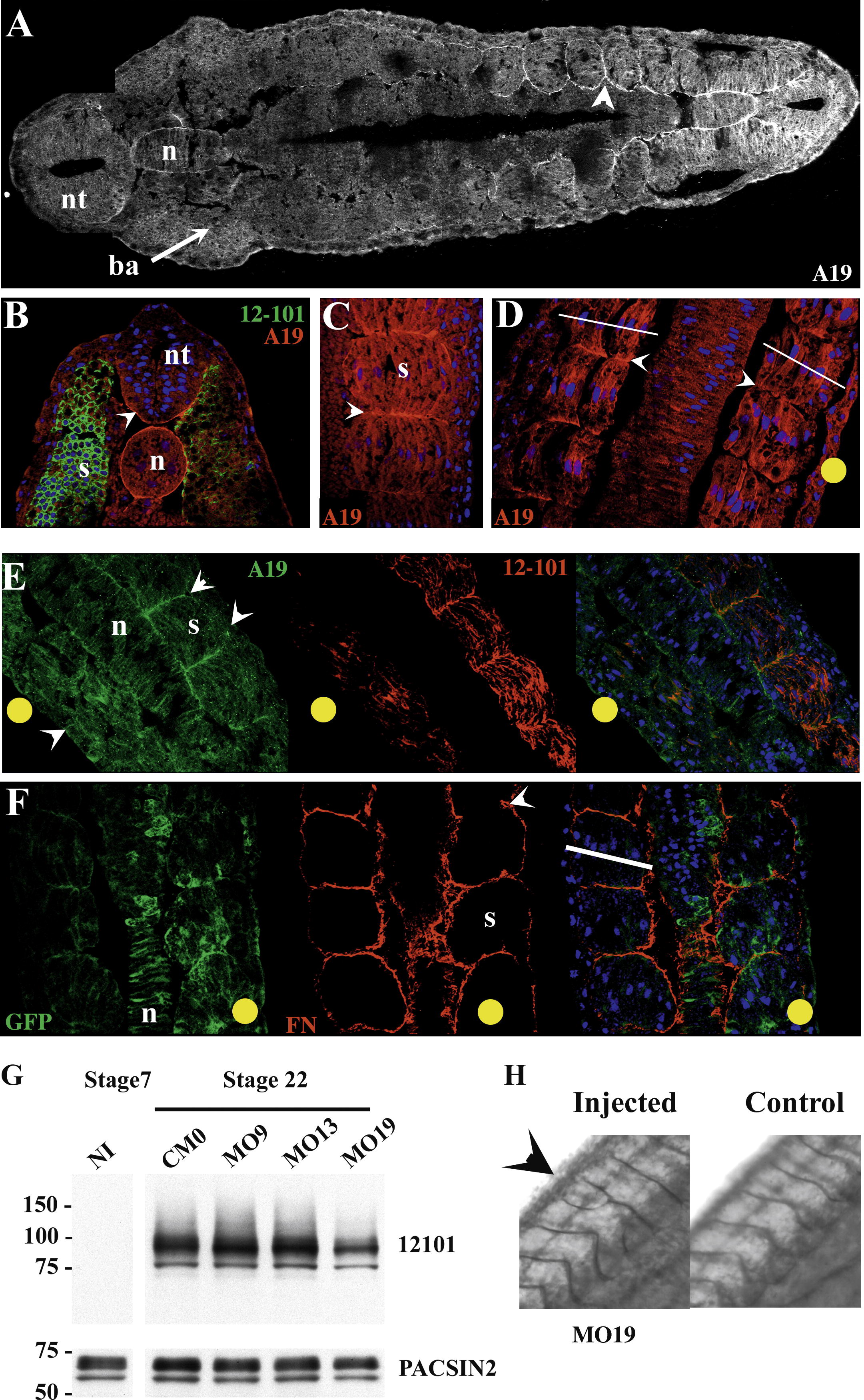 Fig. 8. ADAM19 is essential for somite organization and muscle differentiation. Histological and molecular analysis of embryos with reduced ADAM19 protein. (AâF) Frozen sections of tailbud stage embryos. (AâD) Immunofluorescence using the affinity purified rabbit pAb to the ADAM19 cytoplasmic domain. (A) Frontal section, anterior is to the left. The ADAM19 protein is localized to the intersomitic boundary (arrowhead), the notochord (n), the neural tube (nt) and in the branchial arches (ba). (B) Transverse section. ADAM19 is in red, the muscle marker 12â101 in green and the nuclei (DAPI) in blue. ADAM19 staining appears associated with the ventral basal side of the neural tube (arrowhead) and the notochord (n). (C) Magnification of the somite from a frontal section, ADAM19 is in red, the arrowhead points to the intersomitic boundary. (DâF) Frontal sections of tailbud stage embryos injected at the two-cell stage in one cell with 5 ng of MO19. The injected side is labeled (yellow dots) and was detected either by using the ADAM19 antibody (D and E) or GFP-myc (F) that was co-injected with the MO19. The injection of MO19 completely abolished staining of the intersomitic boundary by the ADAM19 antibody. While the intersomitic boundary is still visible, the nuclei are not aligned on the injected side (white line). (E) ADAM19 is in green (left), 12â101 in red (center) and the merge presented with DAPI staining (right). There is a clear reduction of 12â101 staining on the injected side (MO19). (F) The MO19 was co-injected with GFP-myc to detect the cells that were targeted using the 9E10 mAb. Positive cells are visible in the rightsomites and some of the cells that contribute to the notochord (n). Fibronectin was detected using a rabbit pAb (32F). Some of the FN staining is absent in part of the intersomitic boundary (arrowhead). (G) Western blot using 12â101 on total protein extract. Stage 7 extract is used as a negative control. At stage 22, MO19 injected embryos but none of the other injected embryos have less 12â101 protein. (H) Whole mount immunostaining using mAb 4H2 to detect fibronectin. The injected side was detected prior to fixation using GFP fluorescence. The side injected with the MO19 shows an abnormal pattern of FN staining at some of the intersomitic boundary (arrowhead).