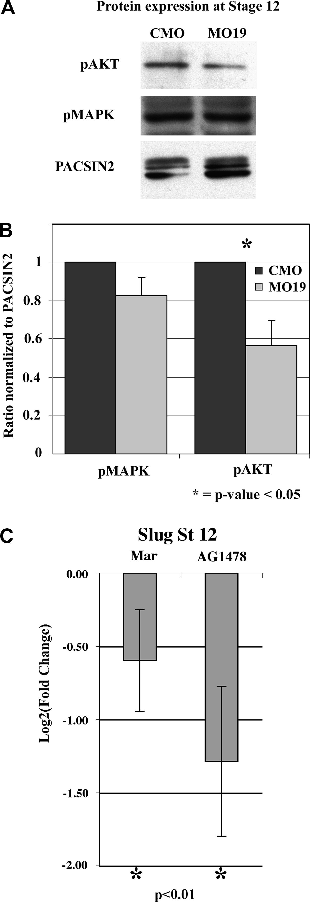 Fig. 9. ADAM19 may interfere with EGF signaling. (A) Western blot using antibody to phosphorylated AKT, phosphorylated MAP kinase, and PACSIN2. Embryos were injected at the one-cell stage with either the control MO (CMO) or MO19. Total protein from 0.5 embryo equivalent were used for each blot. (B) Histogram representing the quantification of the Western blot from three independent injection experiments. All measures were normalized to PACSIN2. Variations in pMAPK were not significant while the decrease in pAKT was significant. (C) Real-time PCR analysis of Slug expression. Embryos were treated with 10 μM of Marimastat (Mar), 100 μM of AG1478 or DMSO (1/1000) as a control, between stages 10 and 12, based on the blastopore size (none of the treatment affected gastrulation timing in these conditions). Marimastat decreased Slug expression by an average of 34% while AG1478 decrease Slug by 60%.