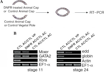 Blocking FGF signaling in animal cap explants induced endoderm that lacked mesoderm inducing activity. (A) Tissue recombination technique. (B) DNFR-expressing recombinants (DNFR animal cap/control animal cap) also expressed early and later endoderm genes, Mixer and edd, as expected. However, the recombinants did not induce the early mesoderm marker, Xbra, nor the late mesoderm markers, actin and globin. An early ventralmesoderm marker (GATA2) was detected in the DNFR animal cap/control animal cap recombinants. This result indicates that the absence of FGF signaling in animal cells generates endoderm, but it is not competent to induce mesoderm in adjacent tissue. RT(â) lane was omitted.