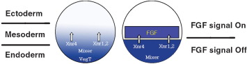 The proposed model: the role of FGF signaling as a regulatory factor in mesendoderm formation. In the two-step model of mesendoderm formation [5] and [11], maternal factors like VegT induce TGF-β-related signaling molecules and these molecules subsequently induce mesendoderm. A modified model is proposed to explain how similar signals can induce two different germ layers and factor(s) that differentiate these two germ layers. In the proposed model, the spatially restricted existence of FGF signaling in the equatorial region acts as a natural barrier to prevent this area from succumbing to a endoderm fate in early embryogenesis. The absence of FGF signaling in the vegetal area is proposed to allow the proper microenvironment for endoderm formation driven by signals within the vegetal cells. In contrast, FGF signaling in the equatorial region is a competence factor for adjacent mesoderm formation in response to vegetal cell signals.