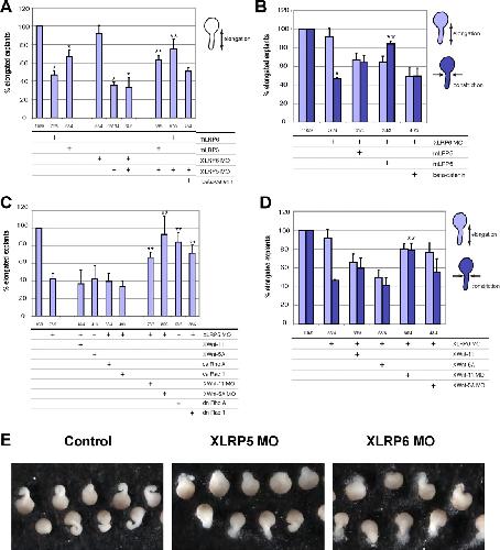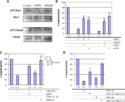 Figure 3. (A) Embryos injected with mLRP5 or XLRP5 MO were lysed and analyzed for the activity of small GTPases Rac1 and Cdc42. (B) XWnt5a- or XWnt11-induced CE defects can be partially rescued by coinjection of Lrp5 or Lrp6 (**, significant rescue of XWnt-11 and XWnt-5a, respectively; p > 0.95). (C) Effects of FL and mutant hLRP6 on CE defects induced by XLRP5 MOs. hLRP6 and also hLRP6 lacking cytoplasmic domain (hLRP6ΔC) can efficiently rescue XLRP5 MO defects, whereas hLRP6 lacking the extracellular domains E1-E4 cannot (**, significant rescue of MO; p > 0.95). (D) Lrp6 lacking cytoplasmic domain (hLRP6ΔC) can rescue elongation defects caused by overexpression of XWnt-11 or XWnt-5a. The numbers under the graphs indicate number of injected embryos/number of independent experiments.