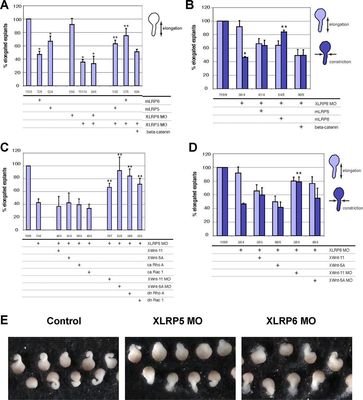 Figure 2. Lrp5/6 are crucial regulators of convergent extension (CE) movements in Xenopus. (A and B) Injection of Lrp5 or Lrp6 mRNA or XLRP5/6 MOs all inhibit convergent extension of Keller explants from stage 10.5 that are rescued by mLrp5/6 but cannot be rescued by β-catenin coinjection (*, significant difference from control; **, significant rescue of MO, p > 0.95). (C and D) The CE defects induced by XLRP5 MO or XLRP6 MO are not rescued by Wnt5a or Wnt11 overexpression or constitutively active (ca) RhoA and Rac1. However, down-regulation of noncanonical signaling by XWnt5a or XWnt11 MO rescued XLRP5 and XLRP6 depletion phenotypes. XLRP5 MO induced inhibition of elongation was also rescued by dn RhoA and Rac1 (**, significant rescue of MO; p > 0.95). (E) Typical morphology of Keller explants injected with XLRP5 and XLRP6 MOs. The numbers under the graphs indicate number of injected embryos/number of independent experiments.