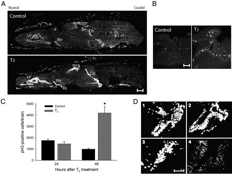 Fig. 2. Thyroid hormone induces cell proliferation in the tadpolebrain by shortening cell cycle time. (A) T3 induces cell proliferation in the premetamorphic tadpole (NF stage 52) brain. Tadpoles were treated as described for Experiment 1 (see Fig. 1) and representative sagittal brain sections are shown stained for BrdU. Abbreviations: LV â lateralventricle, IIIv â third ventricle, tect â optic tectum, Cb â cerebellum. Scale bar = 200 μm. (B) T3 increases cell proliferation as evidenced by an increased number of phosphorylated histone 3 (pH3) positive cells. Tadpoles were treated as described for Experiment 1 and representative sagittal brain sections in the region of the optic tectum are shown stained for pH3. Scale bar = 50 μm. (C) Quantitation of the number of pH3 positive cells throughout the brain of tadpoles treated with or without T3 (50 nM) for 24 or 48 h (n = 5/treatment). Transverse sections were prepared and the number of pH3-positive nuclei were counted for each brain. The asterisk indicates statistically significant difference from controls (P < 0.001; unpaired t-test). (D) T3 shortens cell cycle time in early prometamorphic tadpolebrain. Tadpoles were treated as described for Experiment 2. Transverse brain sections were stained for BrdU. There were no differences in BrdU-ir between brains from control (panel 1) or T3 treated (panel 2) animals 24 h after treatment. However, after 48 h there was a significant increase in the number of BrdU-ir cells in brains of T3-treated animals (panel 4) compared to controls (panel 3). T3-treated animals exhibited more diffuse staining owing to the dilution of the BrdU by cell division. Many BrdU-ir cells seen in panel 4 exhibited elongate nuclei, suggesting that the newborn cells were migrating out of the proliferative zone. Scale bar = 50 μm.