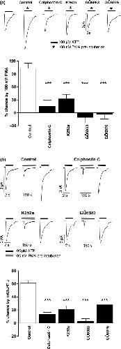 Fig. 1. Potentiation of P2X1 receptor currents by PMA and mGluR1α receptor stimulation is sensitive to inhibitors of novel isoforms of protein kinase C. (a) Representative traces of currents evoked by ATP (100 μM) under control conditions (left) and following treatment with PMA (100 nM) or PMA following incubation with the PKC inhibitors (1 h pre-incubation before 10 min of PMA) calphostin C (1 μM), K252a (100 nM), Gö6983 (200 nM) or Gö6976 (200 nM). The lower panel shows a summary of the effects of the inhibitors on PMA potentiation, n=5–19. (b) Sample traces of the effects of PKC inhibitors and mGluR1α mediated potentiation of P2X1 receptor currents. Application of glutamate (100 μM) evoked a transient inward calcium activated chloride current and potentiated the subsequent ATP current. Potentiation was reduced following pre-treatment of the oocytes with the PKC inhibitors. The lower panel shows a summary of the effects, of the inhibitors on glutamate potentiation, n=3–13. ***p< 0.001.
