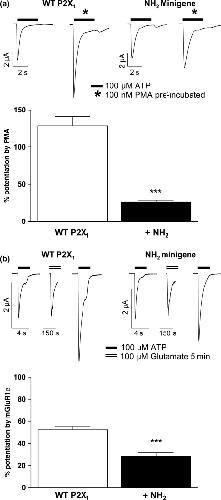 Fig. 2. The N-termini P2X1 receptor minigene blocks the potentiating effects of PMA and mGluR1α receptor stimulation on P2X1 receptor currents. A minigene encoding the N-terminal sequence of the P2X1 receptor was co-expressed with wild type P2X1 and mGluR1α receptors in the Xenopus oocytes. (a) Upper left panels show representative currents evoked by a maximal concentration of ATP (100 μM, indicated by bar) at control oocytes (WT P2X1) and those following 10 min incubation with PMA (100 nM). Right upper panels show the effects of co-expression of the amino terminal minigene (NH2 minigene) on the effects of PMA. The bar chart shows summary data, n=6–7. (b) Upper panels show sample traces for a given oocyte co-expressing P2X1 and mGluR1α receptors (left) or P2X1 receptors, mGluR1α receptors and the P2X1 receptor amino terminal minigene (right traces). Responses to a maximal concentration of ATP (100 μM, indicated by bar) are shown before and after the application of glutamate (100 μM). Glutamate evoked an inward calcium activated chloride current and potentiated subsequent ATP evoked responses. This potentiation was reduced by co-expression of the P2X1 receptor N-terminal minigene. The bar chart shows a summary of the data, n=6–7. ***p< 0.001.