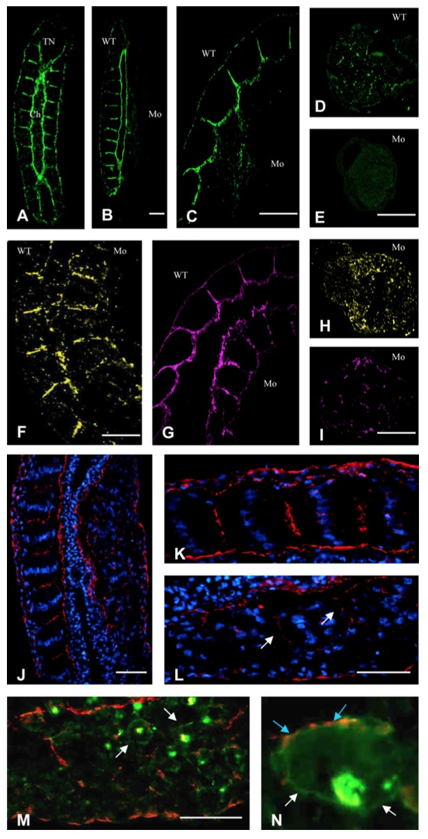 Fig. 7. Dg depletion and Dg without the cytoplasmic domain prevents laminin deposition at the somite boundaries. AâE: Immunodetection of the laminin. A: Frontal section of control embryo, stage 24. The laminin is present around the notochord, the neural tube, and at the intersomitic junctions. B: Frontal section of the ventral region of a unilaterally morpholino (MO) -injected embryo, stage 24. Laminin is detected at the intersomitic boundaries in the uninjected side (left) and absent in the injected side (right). C: Frontal section of the dorsal region of a unilaterally Mo-injected embryo, stage 28. The laminin is absent in the injected side (right) but present at the intersomitic junctions of the control side. D,E: Immunodetection of the laminin in explants. D: Laminin is deposited in control explant. E: MO-treated explant. Laminin was not detected. F: Frontal section, stage 28. Immunodetection of the integrins (injected side on the right). The integrins are localized at the intersomitic junctions in both the control and injected sides. G: Frontal section, stage 28. Immunodetection of the fibronectin (injected side on the right). The fibronectin is detected at the somite boundaries and around the notochord. H,I: MO-injected explants. H: Immunodetection of the integrins. I: Immunodetection of the fibronectin. JâN: Dg-deltaCyto mRNA was delivered unilater- ally and effects of the overexpression of the Dg-cytoplasmic mutant was analyzed at stage 24 on frontal section. JâL: Immunochemistry with Hoechst (blue) and the anti-laminin antibodies (red). J: Laminin is detected around the notochord and at the intersomitic boundaries in the control side (left). Laminin is absent at the intersomitic junctions in the injected side (right). K: Magnification of the control side. The nuclei exhibit a typical oval/elongated shape and are aligned in each somite. The laminin is present at both the somite/notochord and intersomitic boundaries. Somites are cohesives. L: Magnification of the Dg-deltaCyto mRNA-injected side. The nuclei are randomly distributed. The laminin is present at the somite/notochord boundaries, but its deposition at the inter- somitic junctions is severely disrupted. The fluorescence appears sparse within the putative somites (white arrows). M,N: Immunodetection of the green fluorescent protein (GFP) -tagged Dg-deltaCyto (green) and the laminin (red). M: The Dg-deltaCyto proteins are detected at the surface of somitic cells (white arrows). N: Magnification of one cell expressing the Dg-deltaCyto protein. Somitic cells expressing the Dg-deltaCyto proteins (white arrows) were also stained by the anti-laminin antibodies (blue arrows) and both proteins are co-localized at the level of the plasma membrane. Ch, notochord; TN, neural tube; WT, wild-type; Mo, injected side. Scale bar = 100 um.