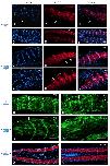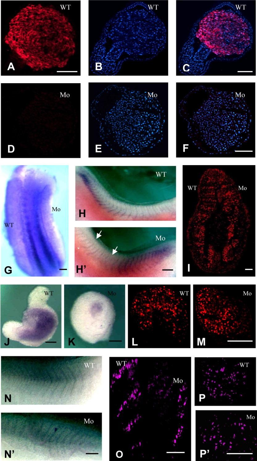 Figure 6. Dystroglycan depletion does not disrupt the myogenic signaling pathway. A-C: Sections of control explant at stage 24 equivalent. A: Immunostaining with the 12/101 antibodies. B: Hoechst. Some nuclei are aligned. C: Merge. D-F: Sections of morpholino (MO) -injected explant at stage 24 equivalent. D: Immunodetection with the 12/101 antibodies. No staining is observed. E: Hoechst. F: Merge. G-H prime : Whole-mount in situ hybridization of XMyoD. G: Stage 24, dorsal view of unilaterally injected embryo (injected side on the right). H: Stage 28, lateral view of the control side. H prime : Stage 28, lateral view of the injected side. The intersomitic junctions are disorganized (white arrows). I: Stage 24, frontal section, immunodetection of the XMyoD protein (injected side at the right). J,K: Stage 24 equivalent, whole-mount in situ hybridization of XMyoD. J: Control explant. K: MO-injected explant. L,M: Stage 24 equivalent, immunodetection of the MyoD protein. L: Control explant. M: MO-injected explant. N-N prime : Stage 28, whole-mount in situ hybridization of XMRF4. N: Lateral view of the control side. N prime : Lateral view of the injected side. O-P prime : Stage 28, immunodetection of the MRF4 protein. O: Frontal section (injected side on the right). P: Control explant. P prime : MO-injected explant. WT, wild-type; Mo, injected side. Scale bar = 70 mu m.
