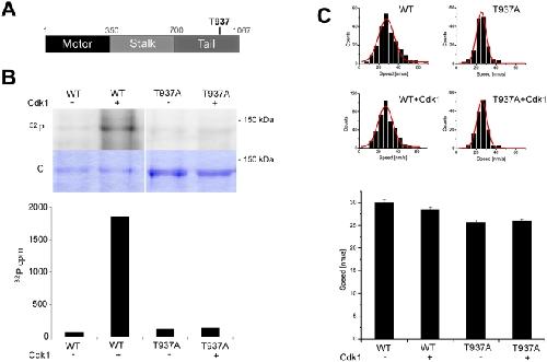 Figure 1. Phosphorylation of Xenopus laevis Eg5 by Cdk1/cyclin B in vitro does not affect its velocity as measured in microtubule gliding assays.(A) Schematic representation of the Eg5 sequence with the phosphorylation site for Cdk1 in the tail (threonine 937). (B) In vitro phosphorylation of wild-type Eg5 and Eg5T937A with [γ32P]ATP in buffer in the presence (+) or absence (−) of Cdk1/cyclin B (top). Autoradiography (32P) and coomassie-stained polyacrylamide gel (C) are shown. Quantitative measurement of radioactivity of the corresponding bands from the SDS-gel. The degree of phosphorylation for wild-type Eg5 is 87.9% and is strongly reduced to 4.0% for Eg5T937A. (C) Phosphorylation does not affect the velocity of Eg5 as measured in microtubule gliding assays: Histograms of gliding velocities of individual microtubules (top) and bar plot of averaged gliding velocities (bottom) produced by wild-type Eg5 (WT) and a non-phosphorylatable mutant (Eg5T937A) treated with or without Cdk1 kinase. Red lines are a Gauss fit, error bars are standard errors. The velocities of phosphorylated and unphosphorylated wild-type Eg5 (WT) are not statistically significantly different (p = 0.067, significance level 0.05); the 12% difference between the velocities of wild-type Eg5 (WT) and the non-phosphorylatable mutant (T937A) is statistically significant (p = 8.6×10−7, significance level 0.05).