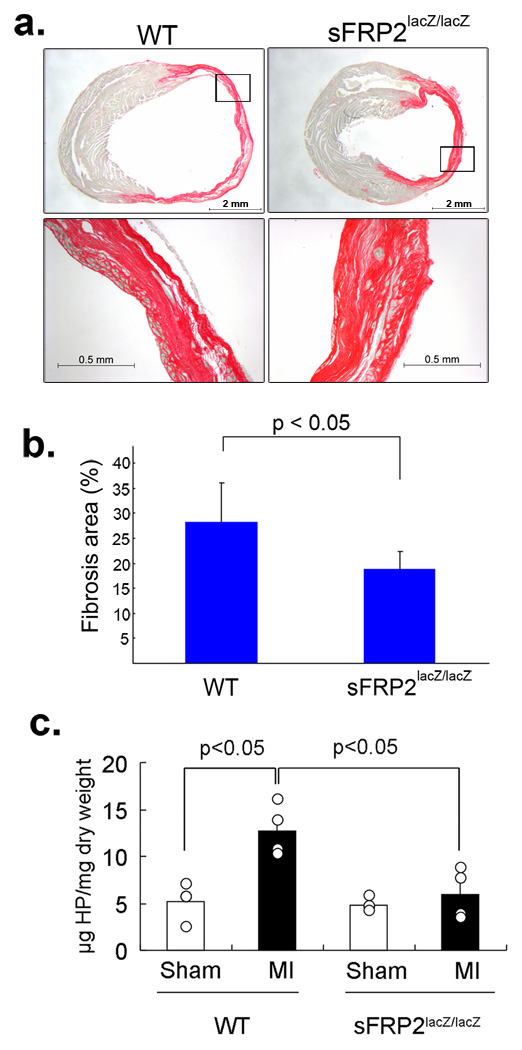 Secreted Frizzled-related proteins (sFRPs) have emerged as key regulators of a wide range of developmental and disease processes. Most of the known functions of mammalian sFRPs have been attributed to their ability to antagonize Wnt signalling. Recently however, Xenopus laevis and zebrafish sFRP, Sizzled, was shown to function as an antagonist of Chordin processing by Tolloid-like metalloproteinases. This has led to the proposal that sFRPs may function as evolutionarily conserved antagonists of chordinase activities of this class of proteinases. In contrast to this proposal, we show here that the mammalian sFRP, sFRP2, does not affect Chordin processing, but instead, can serve as a direct enhancer of procollagen C proteinase activity of Tolloid-like metalloproteinases. We also show that the level of fibrosis, in which procollagen processing by Tolloid-like proteinases has a rate-limiting role, is markedly reduced in Sfrp2-null mice subjected to myocardial infarction. Importantly, this reduced level of fibrosis is accompanied by significantly improved cardiac function. This study thus uncovers a function for sFRP2 and a potential therapeutic application for sFRP2 antagonism in controlling fibrosis in the infarcted heart.