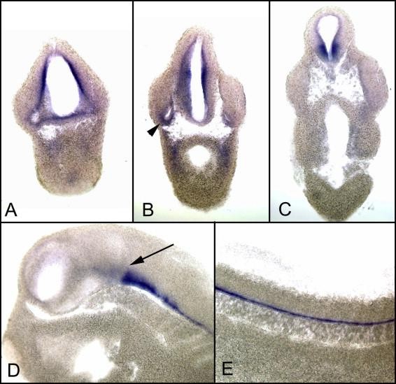 Fig. 4. Sulf1 is expressed in the ventricular zone of the forebrain and midbrain and the floorplate of the neural tube. (A) A cross-section taken at an oblique angle through a stage 28 Xenopus laevis embryo hybridised to Sulf1 showing Sulf1 expression in the ventricular zone in the forebrain. (B) Cross-section through the midbrain showing Sulf1 expression in the ventricular zone. Arrowhead indicates expression in CMZ. (C) Cross-section through the hindbrain showing ventral expression of Sulf1. (D) Sagital-section through the brain showing the ventral expression of Sulf1. (E) Sagital-section through the neural tube showing the expression of Sulf1 in the floorplate and ventralhindbrain. Arrow indicates midbrainâ hindbrain junction.