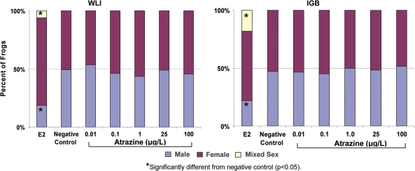 Characterization of atrazine-induced gonadal malformations in African clawed frogs (Xenopus laevis) and comparisons with effects of an androgen antagonist (cyproterone acetate) and exogenous estrogen (17beta-estradiol): Support for the demasculinization/feminization hypothesis.