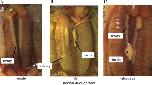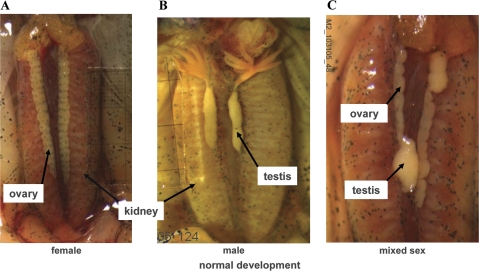 FIG. 4. Gonads of Xenopus laevis after completion of metamorphosis demonstrating clearly differentiated male and female phenotypes by testes (a) and ovaries (b) of negative control animals. The mixed sex gonad (c) exhibiting testicular as well as ovarian tissue was obtained from the positive control of 0.2 μg E2/l treatment.
