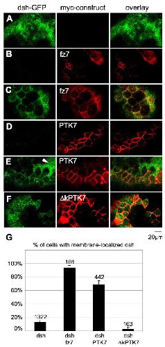 Fig. 1. PTK7 recruits dsh to the plasma membrane. Animal caps were injected with different tagged RNAs, and protein localization was analyzed by confocal microscopy. The GFP-tagged dsh (green, left), the co-expressed myc-tagged protein (red, middle) and the merged pictures (right) are shown. (A) GFP-tagged dsh is localized to the cytoplasm of animal caps injected with 100 pg dsh-GFP RNA. (B) Myc-tagged fz7 is predominantly membrane localized in animal caps injected with 100 pg fz7-myc RNA. (C) Co-injection of 100 pg dsh-GFP and 100 pg fz7-myc RNA leads to membrane recruitment of dsh. (D) PTK7 is membrane localized in animal caps injected with 500 pg myc-tagged PTK7 RNA. (E) Animal caps co-injected with 100 pg dsh-GFP RNA and 500 pg PTK7-myc RNA show membrane-recruitment of dsh. Cells that do not express PTK7 in the membrane do not show membrane-localization of dsh (white arrowhead). (F) Animal caps injected with 250 pg RNA coding for a PTK7 mutant lacking the conserved kinase domain (δkPTK7) and 100 pg dsh-GFP RNA do not show membrane localization of dsh. (G) Graph summarizing the percentage of cells with membrane-localized dsh. For colocalization assays using PTK7 or fz7, only cells in which these proteins were membrane localized were analyzed. To determine the number of cells with cytoplasmic dsh localization DAPI co-staining was used. The total number of cells is indicated above each column.