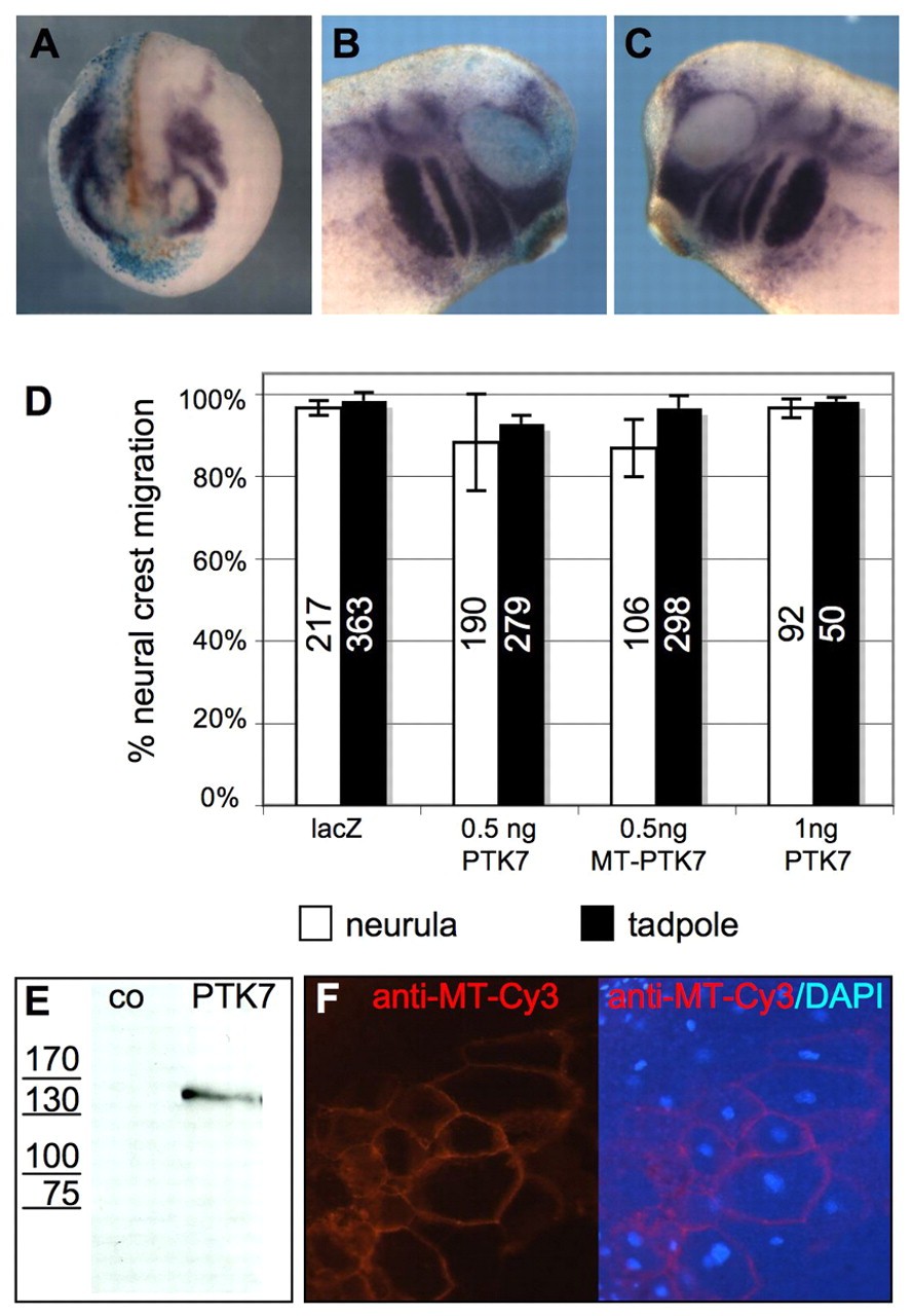 Fig. 5. PTK7 overexpression does not affect neural crest migration. (A-C) Embryos were injected with 1 ng PTK7 RNA and 50 pg lacZ RNA in one blastomere at the two-cell stage and analyzed for twist expression by in situ hybridization at neurula (A) and tadpole stages (B,C). Light blue lacZ staining marks the injected side. Twist-positive neural crest cells show normal migration at neurula (A) and tadpole stages (B,C). (B) Injected side of a tadpole stage embryo. (C) Uninjected side. (D) Graph summarizing the percentage of twist-expressing embryos injected with 50 pg lacZ RNA, 0.5 ng PTK7 RNA, 0.5 ng myc-tagged PTK7 RNA or 1 ng PTK7 RNA at neurula and tadpole stages. Numbers on the columns indicate the number of injected embryos. (E) Confirmation of PTK7 expression using western blotting (co, uninjected controls) or (F) immunostaining on transverse sections of neurula stage embryos injected with 0.5 ng myc-tagged PTK7 RNA. In F, membrane localization can be detected with a Cy3-coupled myc antibody (left panel). Right panel shows an overlay with the DAPI staining.