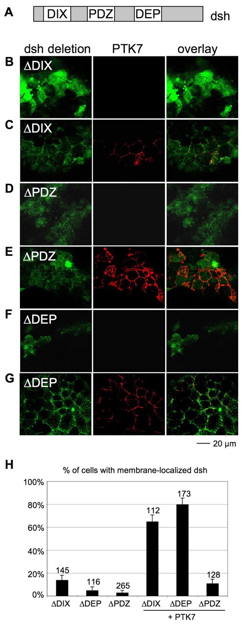 Fig. 2. The PDZ domain is necessary for PTK7-dependent membrane translocation of dsh. (A) Dsh protein structure indicating the DIX, PDZ and DEP domain. RNA of GFP-tagged deletion mutants of these domains were expressed alone or in combination with wild-type PTK7 RNA in animal caps. Protein localization was determined by confocal microscopy. (B) Animal cap injected with 100 pg δDIX-GFP RNA showing cytoplasmic protein localization. (C) Co-injection of 500 pg PTK7-myc RNA partially translocates the cytoplasmic δDIX-GFP protein to the membrane. (D) Animal caps injected with 100 pg δPDZ-GFP RNA show only cytoplasmic localization of the protein. (E) The same is seen after co-expression with PTK7-myc RNA. (F) Animal caps injected with 100 pg δDEP-GFP RNA express the protein in the cytoplasm, whereas (G) co-injection of 100 pg PTK7-myc RNA leads to membrane recruitment. (H) Graph summarizing the percentage of cells with membrane-localized dsh. Only cells with membrane expression of PTK7 were analyzed for dsh localization. The total number of cells is indicated on each column.