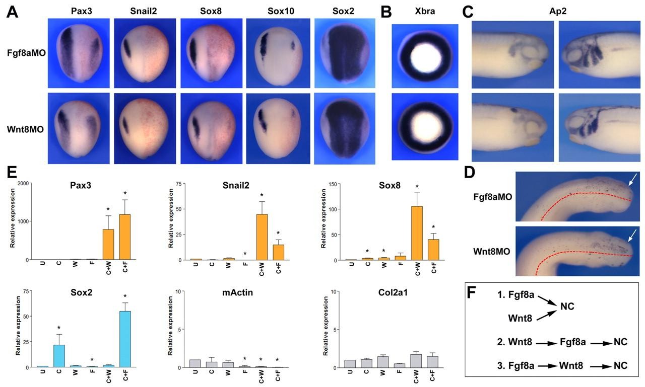 Two independent signals are necessary for neural crest (NC) induction in Xenopus: a Bmp signal, which must be partially attenuated by Bmp antagonists, and a separate signal mediated by either a canonical Wnt or an Fgf. The mesoderm underlying the NC-forming region has been proposed as a source of this second signal. Wnt8 and Fgf8a are expressed in this tissue around the time of NC induction and are therefore good candidate NC inducers. Loss-of-function studies indicate that both of these ligands are necessary to specify the NC; however, it is unclear whether these signaling molecules are operating in the same or in parallel pathways to generate the NC. Here, we describe experiments addressing this outstanding question. We show that although Wnt8 expression can restore NC progenitors in Fgf8a-deficient embryos, Fgf8a is unable to rescue NC formation in Wnt8-depleted embryos. Moreover, the NC-inducing activity of Fgf8a in neuralized explants is strongly repressed by co-injection of a Wnt8 or a beta-catenin morpholino, suggesting that the activity of these two signaling molecules is linked. Consistent with these observations, Fgf8a is a potent inducer of Wnt8 in both whole embryos and animal explants, and Fgf8a knockdown results in a dramatic loss of Wnt8 expression in the mesoderm. We propose that Fgf8a induces NC indirectly through the activation of Wnt8 in the paraxial mesoderm, which in turn promotes NC formation in the overlying ectoderm primed by Bmp antagonists.