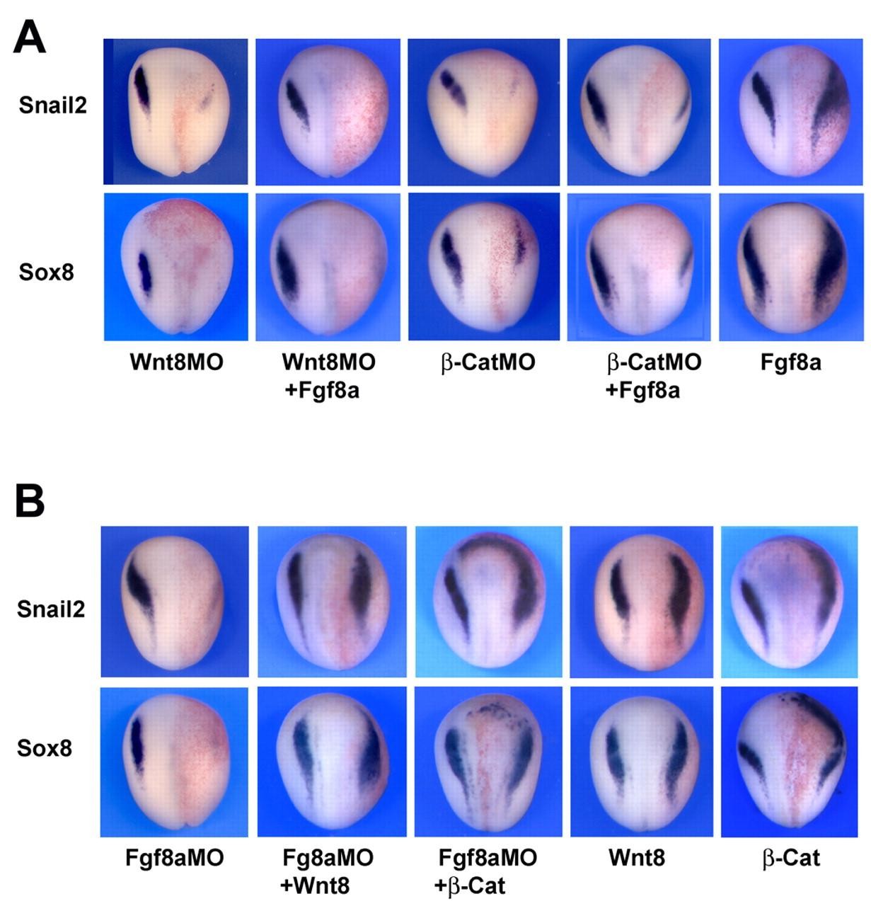 Fig. 2. Fgf8a and Wnt8 differ in their ability to restore NC progenitors in Wnt8- and Fgf8a-deficient embryos. (A) Fgf8a mRNA injection fails to rescue Snail2 and Sox8 expression at the neural plate border of embryos injected with Wnt8MO (25ng) or β-CatMO (25 ng). A single injection of Fgf8a mRNA (2.5 pg) expands Snail2 and Sox8 expression domains. (B) Conversely, Wnt8 (100 pg) or β-catenin (200 pg) plasmid DNA injection restores Snail2 and Sox8 expression in embryos injected with Fgf8aMO (50 ng). Injection of Wnt8 or β-catenin in sibling embryos expanded Snail2 and Sox8 expression domains. In all panels, embryos are viewed from the dorsal side with anterior to the top. The injected side is to the right.