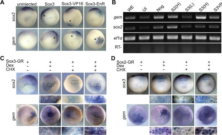 Fig. 2. Sox3 activates geminin and sox2 expression in the absence of protein synthesis. (A) WISH of stage 12 embryos injected with sox3, sox3-VP16, or sox3-EnR mRNA (200â800 pg) at the 1-cell stage. Sox3 and Sox3-VP16 expand expression of sox2 and gem (arrows) and Sox3-EnR induces gem in stage 12 embryos. Images are ventral view with the anterior to the top. (B) High levels of Sox2 and Sox3 induce expression of gem in ectodermal explants. RT-PCR analysis of ectodermal explants for sox2, gem and ef1α expression from embryos injected with noggin (25 pg), sox2, sox3 (500 or 800 pg) and sox3-VP16 (200 pg). Sibling embryos were stage 12. (C) Sox3-GR induces expression of sox2 (Dex, n = 22/30; Dex + CHX, n = 12/20) and gem (Dex, n = 31/35; Dex + CHX, n = 46/54). (D) Sox2-GR induces gem in the absence of protein synthesis (Dex, n = 25/43; Dex + CHX, n = 35/47). WISH of embryos injected with either Sox2-GR or Sox3-GR (400 pg) and incubated without or with Dex (1 μM), CHX (10 μM), or Dex + CHX at either stage 9.5 or 11 and collected at stage 12. Hatched rectangle indicates region of flat mount high magnification shown below whole embryo images. |