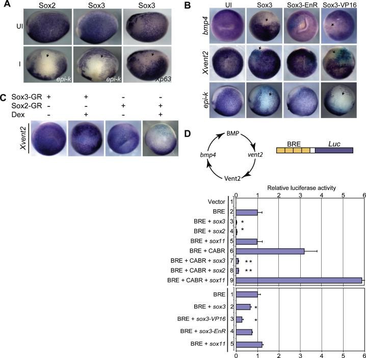 Fig. 4. Sox3, Sox2 and Sox3-VP16 inhibit Xvent2 expression and epidermal formation. (A) WISH for epi-k and Xp63 in embryos injected with 400â800 pg of sox3 or sox2 mRNA with lacZ (100 pg) mRNA into one of 2-cells. Uninjected (UI) side in top row, injected (I) side in bottom with arrow indicating injected area. Anterior is to the left and dorsal to the top. (B) Sox3, sox3-EnR, or sox3-VP16 mRNA (200â400 pg) was injected with lacZ mRNA into one of 2 blastomeres and gastrula or neurula embryos were assayed for bmp4, Xvent2 or epi-k expression by WISH. Bmp4 and Xvent2 (st. 12) embryos are animal pole view with the dorsal side to the top and epi-k embryos (st. 17) are a lateral view with anterior to the left. (C) WISH of stage 12 embryos injected with Sox3-GR into one blastomere of 2-cell embryos and untreated or treated with Dex at stage 9.5. Embryos are an animal pole views with dorsal to the top. (D) Diagram of BMP positive feedback loop, BRE-luciferase construct and relative luciferase activities in bar graph form. One-cell embryos were injected in the animal pole with vector or BRE-luciferase with sox3, sox2, sox11, sox3-EnR (400 pg), or sox3-VP16 mRNA (200 pg) and 50 pg CABR mRNA (top: lanes 3â9, and bottom: 2â5). The graph represents one experiment done in triplicate. Horizontal lines represent standard deviations. *p < 0.05 indicates values that differ significantly from lane 2 and **p < 0.01 indicates values that differ significantly from lane 6, Studentâs t-test. |