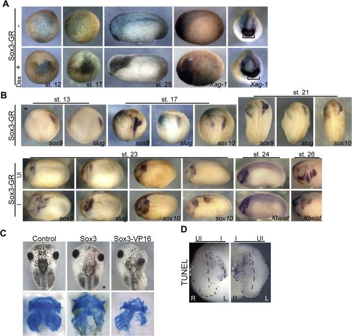 Fig. 6. Sox3 interferes with neural crest formation and migration. (A) Overexpression of sox3-GR induces ectopic pigment (129/181) and expands the cement gland but does not induce ectopic cement gland as indicated by WISH of Xag-1 (n = 49/77) in two right panels. (B) WISH of sox9 (n = 47/68), slug (n = 36/57), and sox10 (n = 46/56) in embryos injected with Sox3-GR and lacZ mRNA. Dorsal view of stages 13â21 embryos with anterior to the top (top row). Asterisk marks injected side. After stage 21, expression is expanded (bottom row) (sox9, n = 33/38, slug, n = 50/52, sox10, n = 50/50), but migration is inhibited (Xtwist, n = 96/130). Uninjected and injected sides of same embryo shown. (C) Development of branchial cartilage is disrupted by Sox3 and Sox3-VP16 as demonstrated by cartilage staining using Alcian blue. Embryos are dorsal view with anterior to the top and cartilage is ventral view with anterior to the top. (D) Two representative embryos demonstrating that Sox3 induces apoptosis in the head region as marked by TUNEL staining (n = 13/22). Left embryo injected in the left side and right embryo injected in the right side to account for potential asymmetric cell death. All embryos injected in 1 of 2 cells with sox3 (400 pg), sox3-VP16 (100 pg) or sox3-GR (400 pg) and lacZ (100â200 pg) or GFP (300 pg) mRNA. |