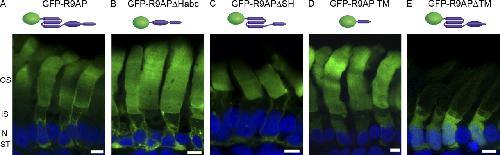 Figure 3. Localization of GFP-tagged R9AP and R9AP mutants in transgenic Xenopus rods. The following constructs were expressed in transgenic Xenopus rods: full-length GFP-tagged R9AP (A), GFP-tagged R9AP lacking the Habc domain (B), and GFP-tagged R9AP lacking the SNARE homology (SH) domain (C). (D) GFP-tagged transmembrane domain from R9AP. (E) GFP-tagged R9AP lacking the transmembrane domain. In all panels nuclei are counterstained with Hoechsts (blue). OS, outer segment; IS, inner segment; N, outer nuclear layer; ST, synaptic terminal. Bars, 5 μm. |