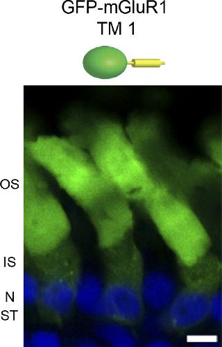 Figure 7. Localization of a random GFP-tagged transmembrane domain in transgenic Xenopus rods. GFP-tagged transmembrane segment 1 from mGluR1. Bar, 5 μm. |