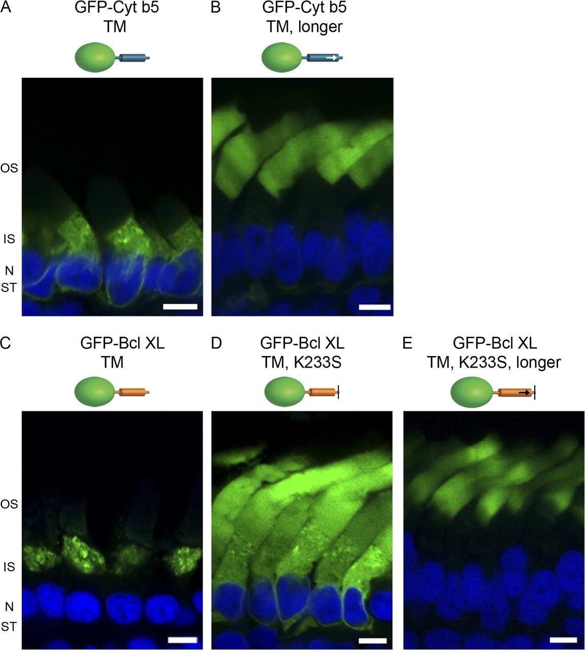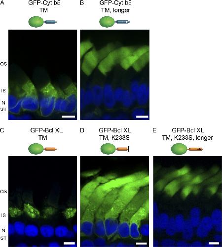 Figure 8. Localization of ER and mitochondrial-targeted GFP-tagged transmembrane domains and their length mutants in transgenic Xenopus rods. The following constructs were expressed as GFP fusion proteins in Xenopus rods (see Table S2 for sequence details, available at http://www.jcb.org/cgi/content/full/jcb.200806009/DC1): (A) transmembrane domain from microsomal cytochrome b5 (Cyt b5); (B) transmembrane domain from cytochrome b5 elongated by four amino acid residues; (C) transmembrane domain from Bcl XL; (D) transmembrane domain from Bcl XL bearing a point mutation (K233S); (E) transmembrane domain from Bcl XL bearing the K233S mutation and elongated by four amino acid residues. OS, outer segment; IS, inner segment; N, outer nuclear layer; ST, synaptic terminal. Bars, 5 μm. |