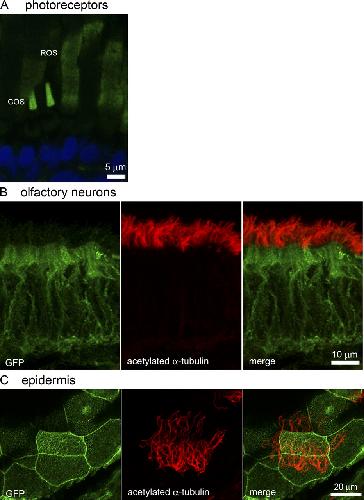 Figure 10. Patterns of transgenic GFP-R9AP or GFP-syntaxin 3 transmembrane domain expression in ciliated Xenopus tissues. (A) GFP-tagged full-length R9AP expressed in photoreceptors. (B) GFP-tagged transmembrane domain from syntaxin 3 expressed in olfactory cells and in the epidermis (C). (B and C) Cilia are labeled with an antibody against acetylated α-tubulin (red). COS, cone outer segment; ROS, rod outer segment. |