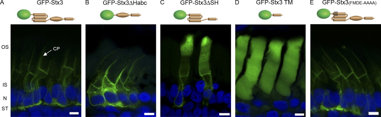 Figure 4. Localization of GFP-tagged syntaxin 3 and syntaxin 3 mutants in transgenic Xenopus rods. (A) Full-length GFP-tagged syntaxin 3 (Stx3). The arrow indicates the calycal processes (CP). (B) GFP-tagged syntaxin 3 lacking the Habc domain. (C) GFP-tagged syntaxin 3 lacking the SNARE homology domain. (D) GFP-tagged transmembrane domain from syntaxin 3. (E) Full-length GFP-tagged syntaxin 3 with the FMDE motif mutated to four alanines. OS, outer segment; IS, inner segment; N, outer nuclear layer; ST, synaptic terminal. Bars, 5 μm. |