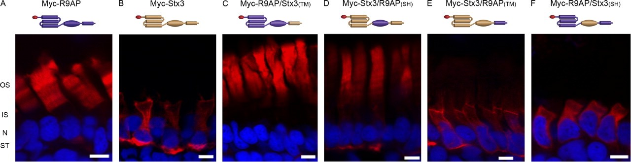 Figure 6. Localization of Myc-tagged R9AP/syntaxin 3 chimeras in transgenic Xenopus rods. (A) Full-length Myc-tagged R9AP. (B) Full-length Myc-tagged syntaxin 3 (Stx3). (C) Myc-tagged chimera of R9AP containing the transmembrane domain from Stx3. (D) Myc-tagged chimera of syntaxin 3 containing the SNARE homology domain from R9AP. (E) Myc-tagged chimera of syntaxin 3 containing the transmembrane domain from R9AP. (F) Myc-tagged chimera of R9AP containing the SNARE homology domain from syntaxin 3. OS, outer segment; IS, inner segment; N, outer nuclear layer; ST, synaptic terminal. Bars, 5 μm. |