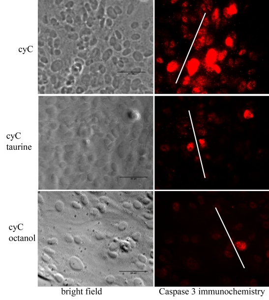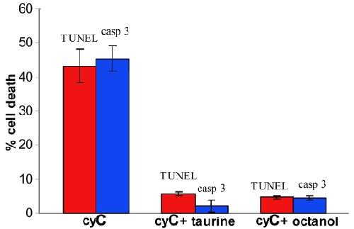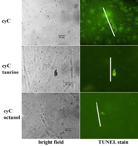 To determine whether taurine exerts a protective effect on retinal pigment epithelium (RPE) cells exposed to a cytotoxic agent, cytochrome C (cyC), shown previously to induce apoptosis and produce cell death in electrically coupled neighboring cells. Monolayer cultures of confluent human RPE (ARPE-19) cells, which express gap-junctional proteins, were incubated in culture medium with or without taurine. After scrape loading cyC into the cells, we assayed these cells for caspase 3 activity and terminal deoxynucleotidyl transferase dUTP nick end labeling (TUNEL) staining to determine the spread of apoptosis. We found that cyC, too large a molecule to traverse gap junctional channels, produced apoptosis in cells injured by the scrape as well as those distant from the site of the scrape, presumably by the intercellular transmission of a toxic agent through the gap junctions that couple these cells. Incubation in taurine, or the gap-junction blocker, octanol, before application of cyC, reduced significantly the fraction of cells undergoing apoptosis. Voltage clamp recordings from electrically coupled Xenopus oocytes transfected with Cx43 showed that junctional communication was unaffected by taurine. Our results indicate that taurine can serve to suppress cell death in RPE cells independent of any effect on gap junctions. We have considered various avenues by which taurine can exert its protective effect, but the precise mechanism involved under these experimental conditions has yet to be identified.