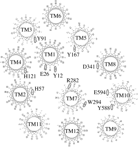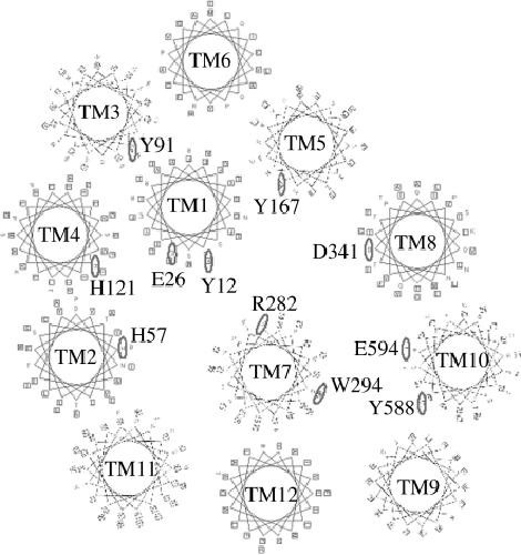Figure 1. Helical wheel plan of the TMDs in PepT1 showing the putative relative proximity of H57, R282 and D341 in the TMDs 2, 7 and 8, respectively, in the homology model of rabbit PepT1 (modified from Meredith & Price 2006).