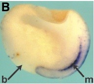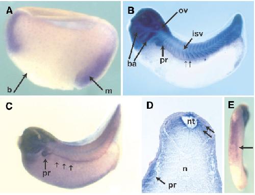 Fig. 1. Developmental expression of C1qA. (A) Bissected gastrula. Dorsal is to the right. Expression is restricted to the marginal zone mesoderm indicated by the arrow;(b) blastpore, (m) mesoderm. (B) Stage 28 embryo. Anterior is to the left and dorsalto the top. There is strong expression in the cephalic structures, especially in the branchial arches (ba) and in the otic vesicle (ov). Expression in the intersomitic veins is visible (isv). Pronephric expression has begun (pr). The small arrows indicate expression in the pronephric duct. (C) Stage 35 embryo shows detailed expression in pronephros (pr) and duct. At this stage, expression in the lateral muscle presursors (small arrows) is visible ventral to the duct. (D) Transverse section through an age- matched embryo to (C). The section is at the level of the pronephros. Dorsal is to the top. Somitic expression is most pronounced in the cells adjacent to the neural tube (nt) as indicated by the small arrows, and in the pronephros (pr). There is no staining in the notochord (n). (E) Ventral view of a stage 35 embryo reveals staining consistent with ventral blood island expression (arrow). |